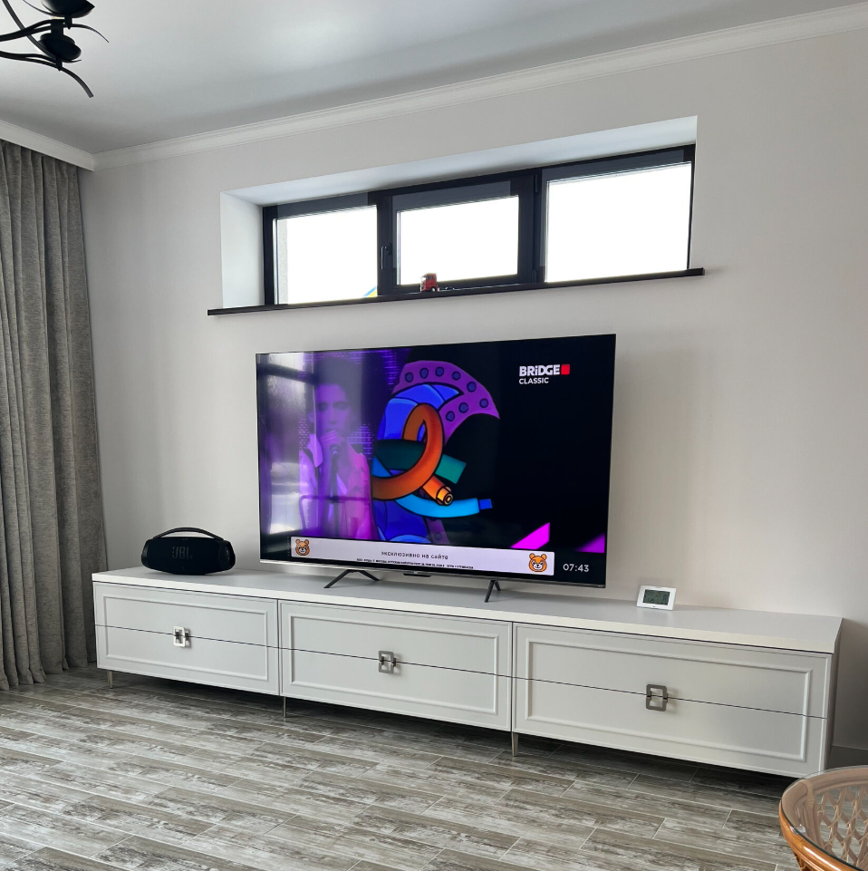 Для этого интерьера мы изготовили ТВ-тумбу, которая идеально вписывается в пространство и полностью повторяет стиль существующих дверей в доме. Благодаря этому вся комната выглядит гармонично, а мебель создаёт ощущение единого ансамбля с остальными элементами интерьера.