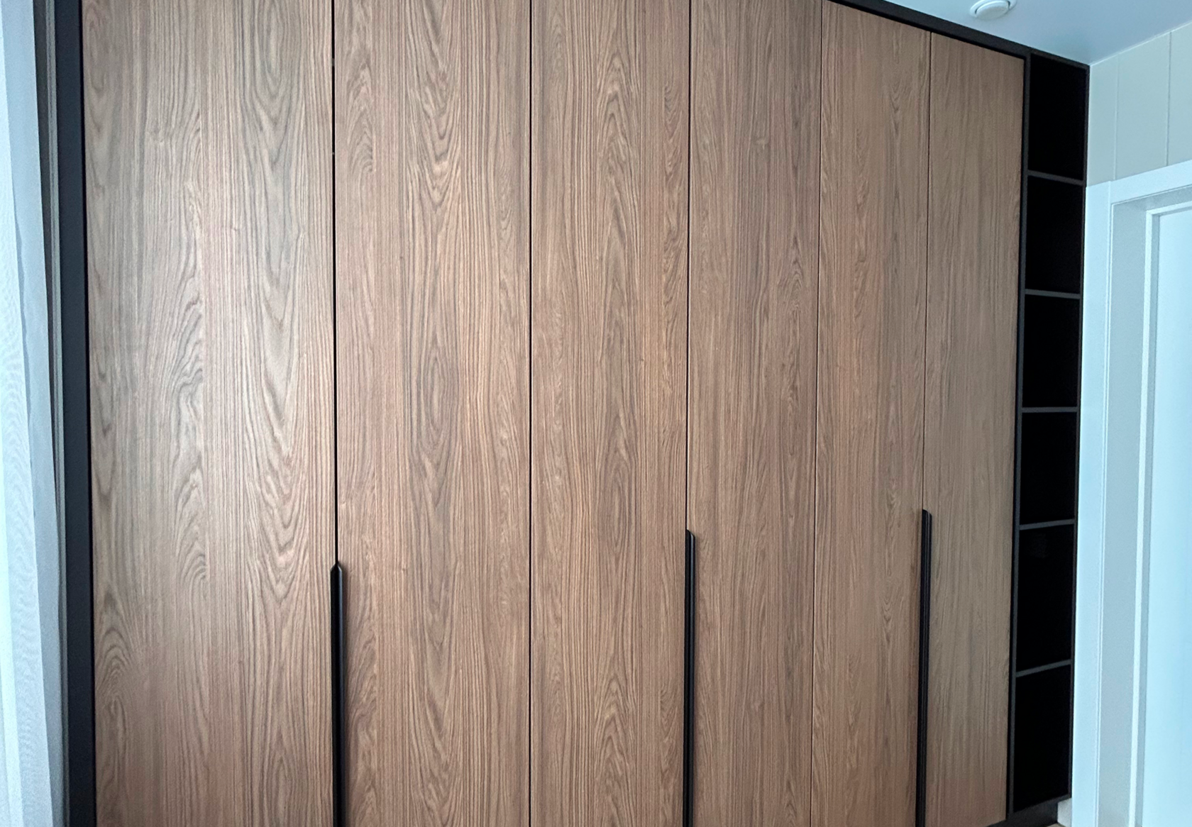 Когда хочется объединить функциональность, эстетику и идеальный порядок — выбирайте шкаф во всю стену! Высокие фасады тёплого древесного оттенка, аккуратные вертикали и лаконичные чёрные акценты создают современный интерьер, в котором каждая деталь продумана.