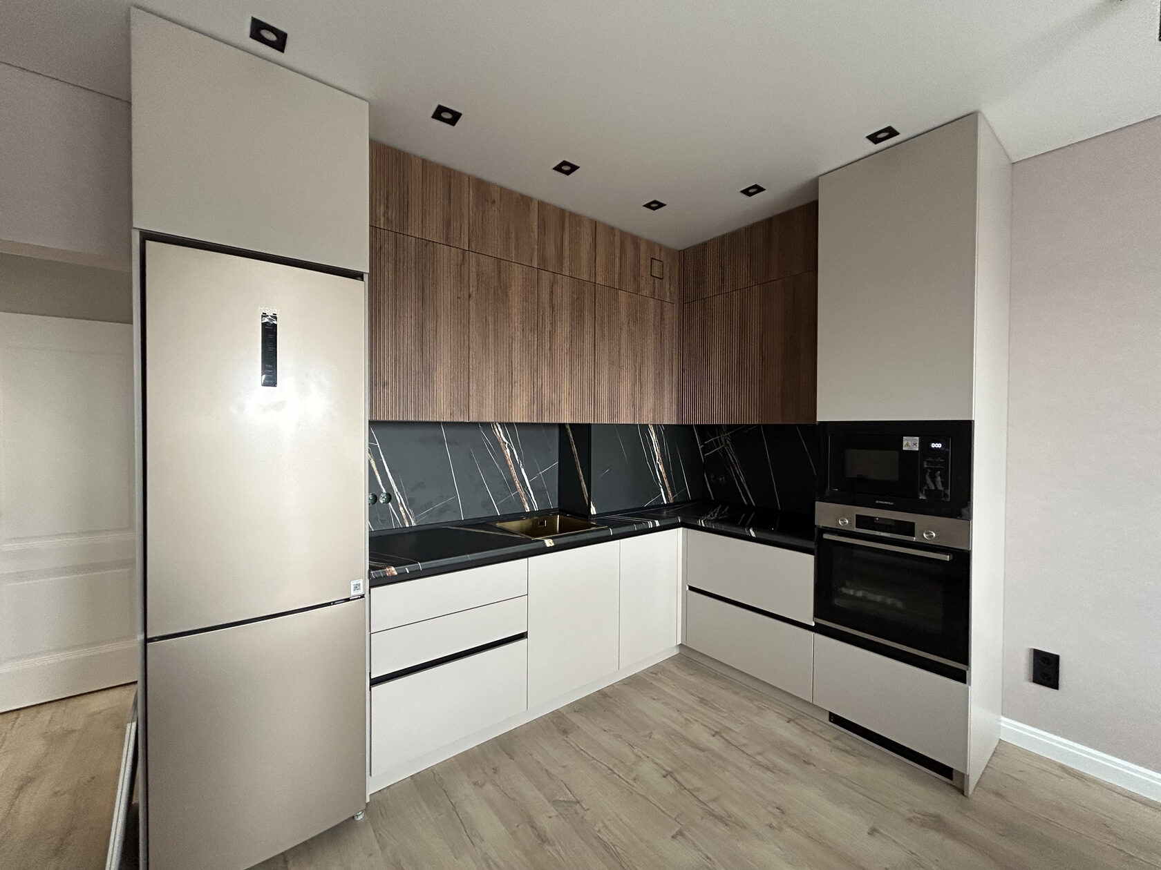 По запросу клиента мы спрятали вентиляционный короб, аккуратно интегрировав его в конструкцию шкафов. Это решение сохранило эстетику и симметрию пространства. Кухня получилась функциональной, стильной и визуально лёгкой — именно такой, какой её задумывали.
