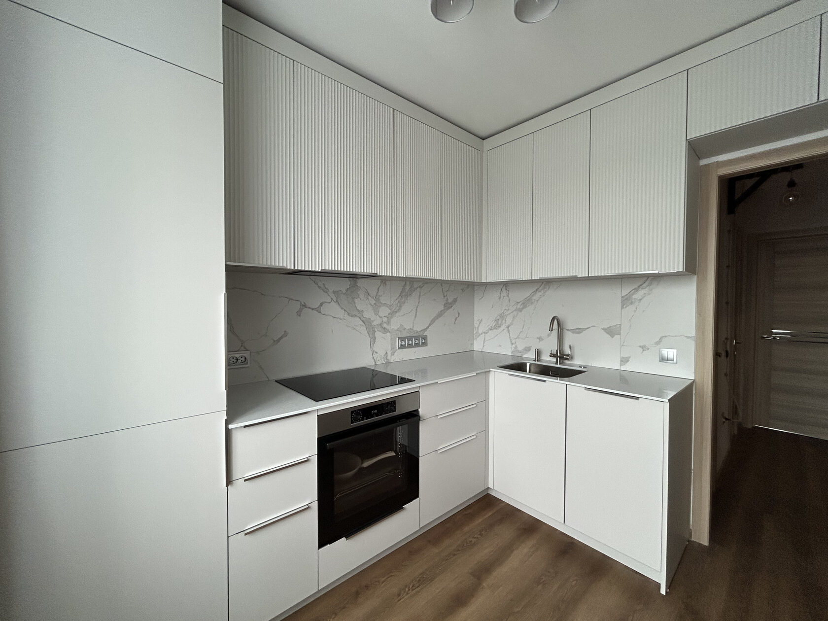 Нежная белоснежная кухня — воплощение лёгкости, уюта и продуманности. Лаконичные светлые фасады с вертикальной фрезеровкой добавляют интерьеру фактурности и глубины. Каменные фартук и столешница не только гармонично дополняют общий образ, но и отличаются практичностью, их легко поддерживать в идеальной чистоте.