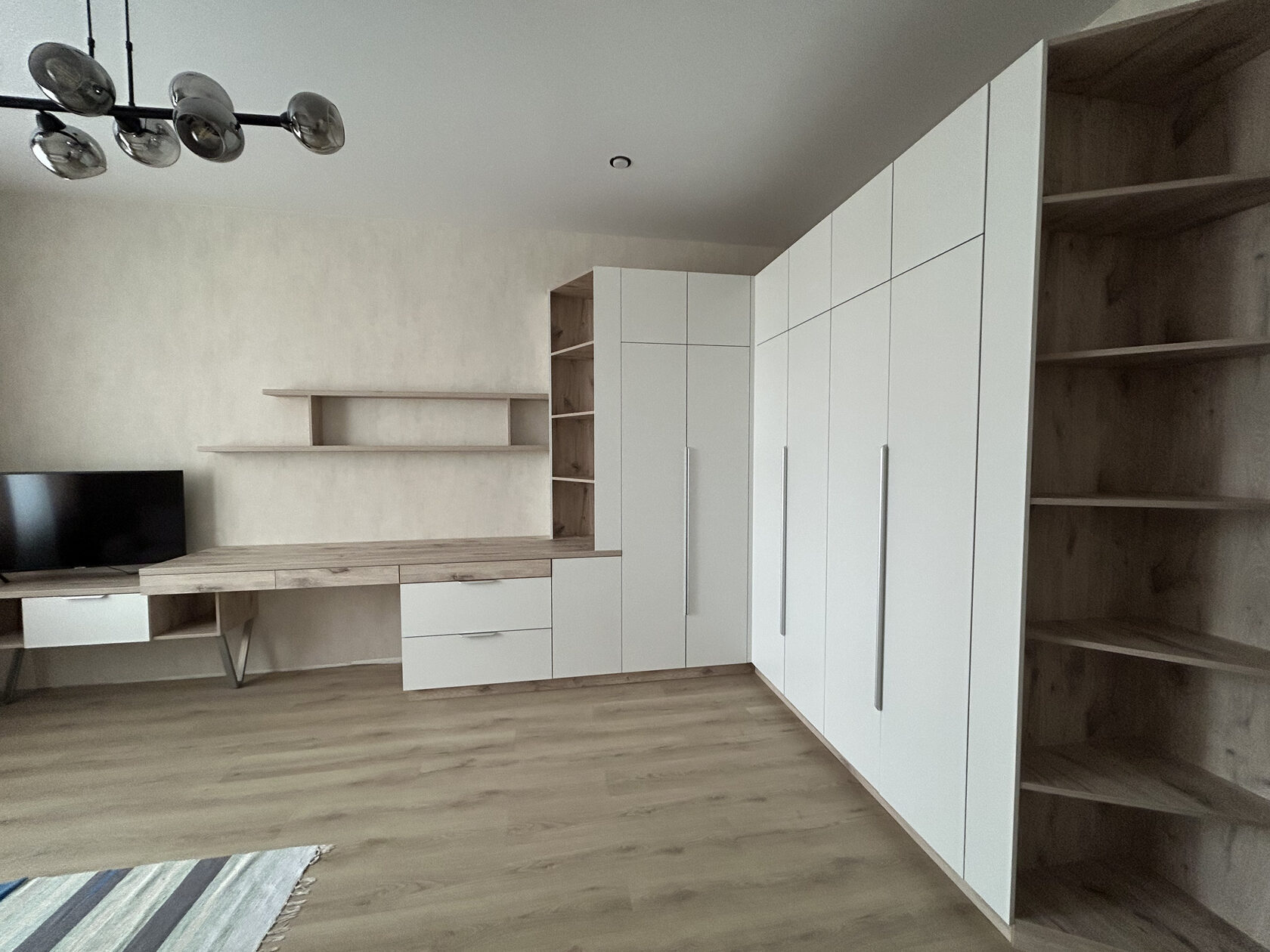 Совмещённая мебель — идеальное решение, когда нужно уместить всё и сохранить воздух в пространстве. Здесь шкаф во всю стену объединён с интегрированной ТВ-тумбой и удобной рабочей зоной. Светлые тона и лаконичный дизайн визуально расширяют комнату, а продуманная система хранения помогает поддерживать порядок каждый день.