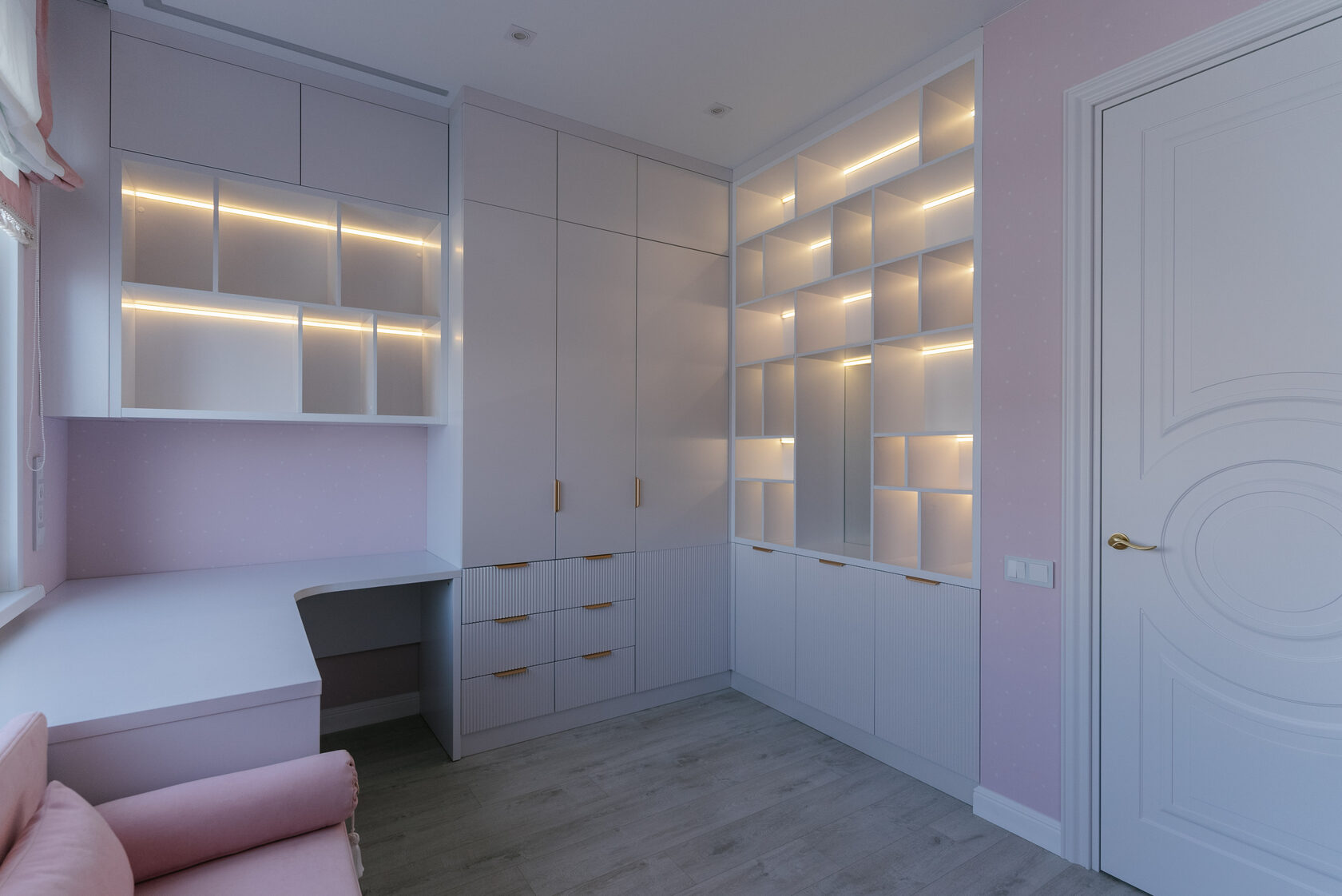 Этот угловой шкаф был выполнен по индивидуальному заказу с одной ключевой задачей — максимально точно сохранить визуал дизайн-проекта. Благодаря вниманию к деталям и точной проработке пропорций мебель выглядит так, будто она изначально была частью пространства. Нежная пастельная палитра, аккуратные фасады без лишних акцентов и продуманное сочетание закрытых секций с открытыми нишами создают лёгкую, воздушную композицию. Шкаф объединяет в себе системы хранения для одежды, учебной зоны и декоративных элементов — всё размещено так, чтобы поддерживать идеальный порядок и не перегружать интерьер.