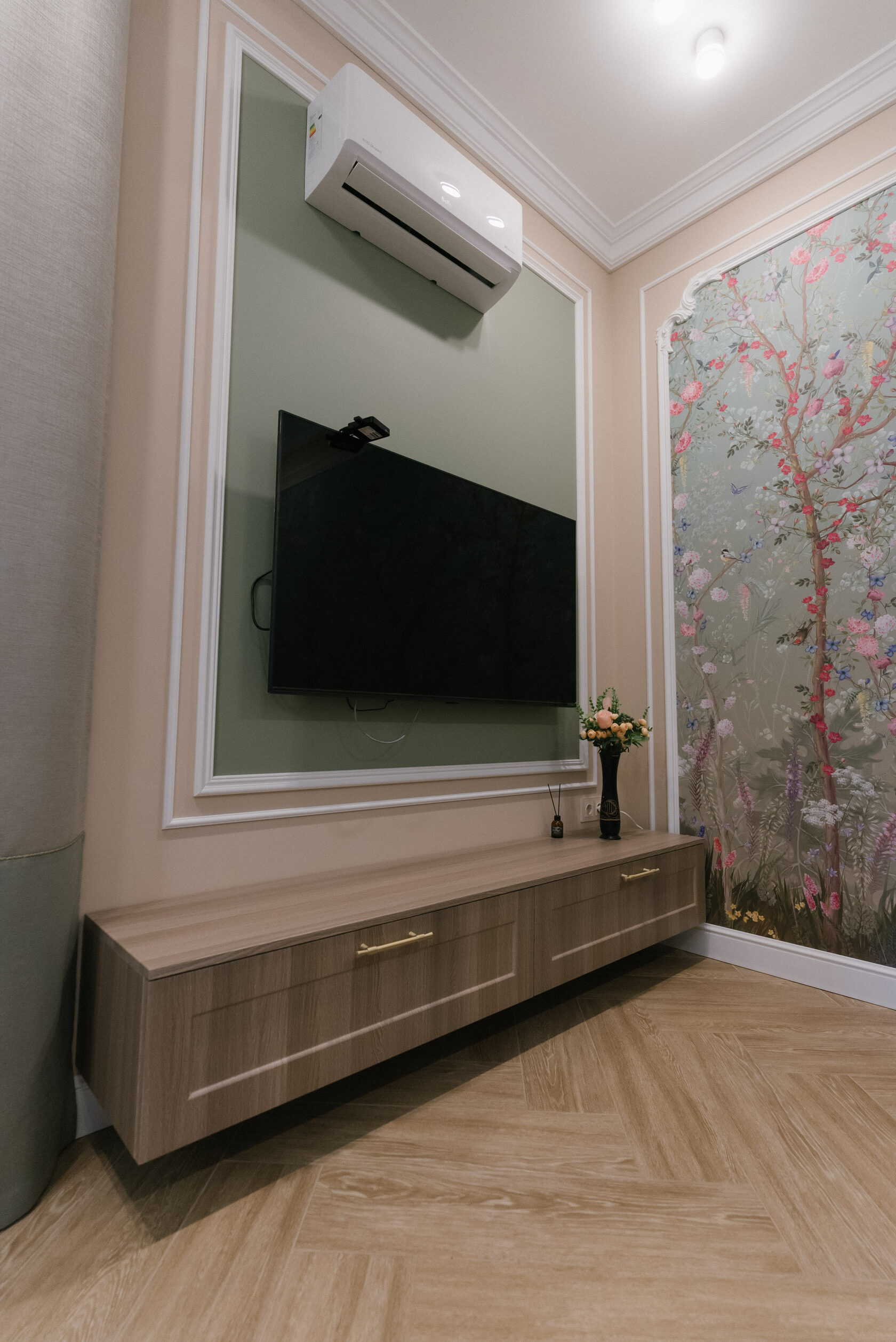 Подвесная тумба всегда смотрится легко и современно, создавая ощущение простора в комнате. Этот вариант особенно удобен в быту — под тумбой легко проводить уборку, ведь никакие ножки и препятствия не мешают свободному перемещению техники, например, робота-пылесоса.