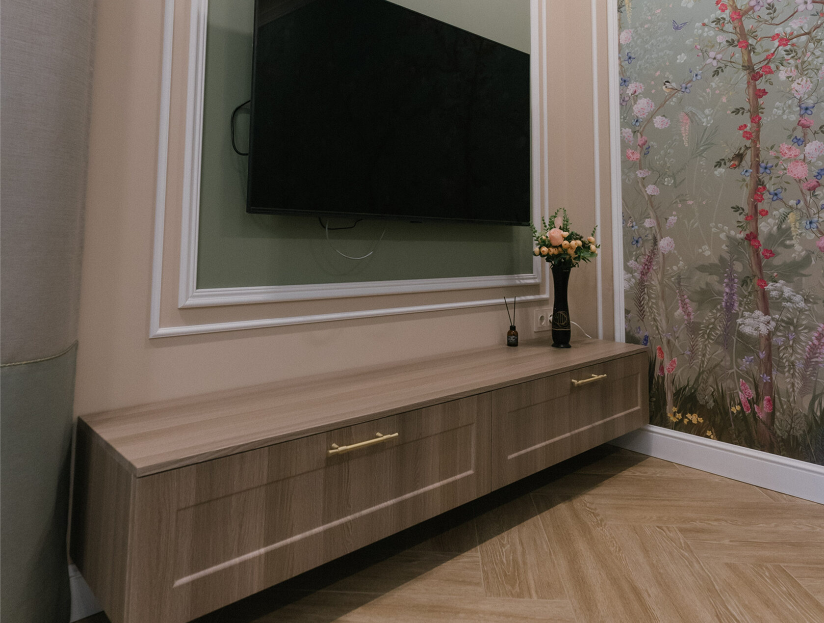 В данном проекте наша задача была точно повторить мебель из дизайн-проекта клиента. Мы уделили внимание каждой детали: подобран натуральный оттенок дерева, стильные фасады украшены аккуратными ручками, а пропорции изделия гармонично сочетаются с интерьером. Такая тумба не только практична, но и добавляет интерьеру изысканности за счёт плавных линий и элегантного декора.