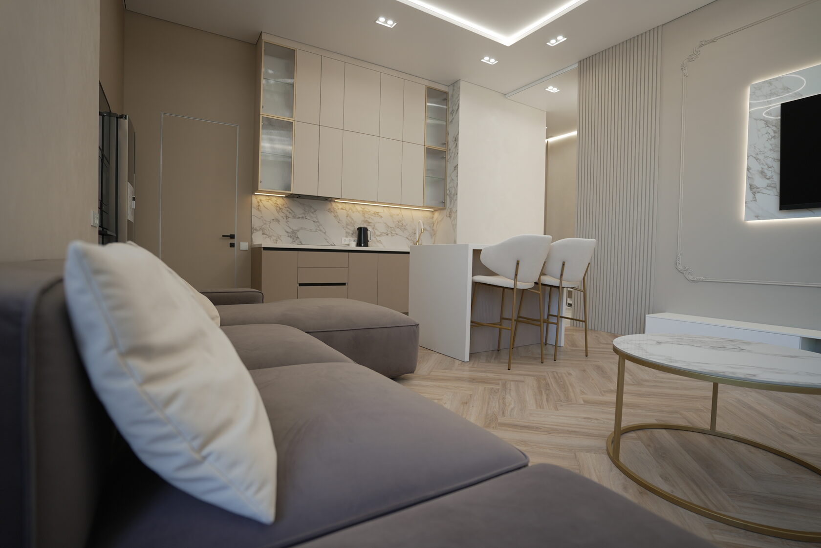 Кухня выполнена с каменной столешницей, рифлёным стеклом и встроенной подсветкой, создающей уютное мягкое освещение. Здесь есть всё для комфортной жизни: встроенная вытяжка, посудомойка, удобная выдвижная колонна и винный холодильник. Чистые линии, скрытые розетки и плавное открывание ящиков делают это пространство современным, лаконичным и по-настоящему продуманным.