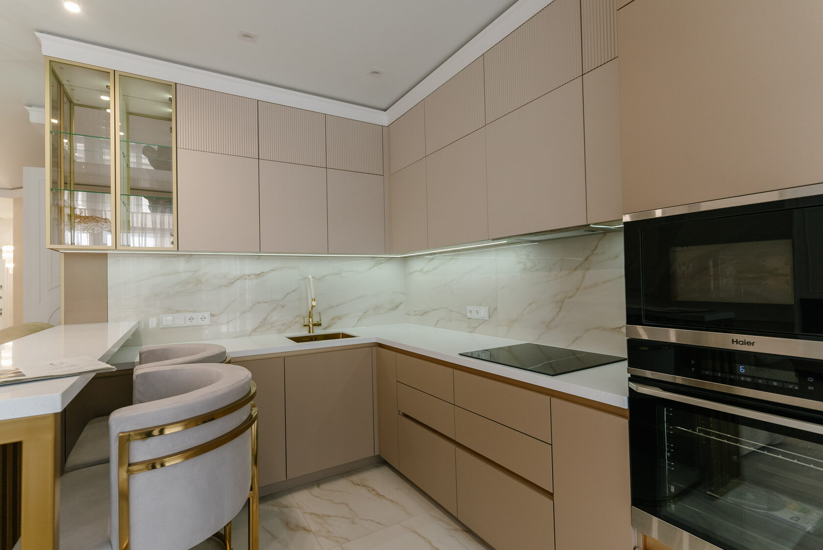 По проекту изначально планировалась большая барная стойка, но мы адаптировали размеры вместе с заказчиком, чтобы сохранить комфорт и лёгкость. Встроенный холодильник, вытяжка и продуманная система хранения делают кухню максимально удобной, а регулировка подсветки с выключателя — простым и надёжным решением для ежедневного использования.
