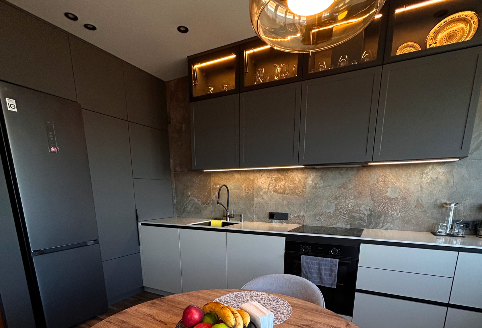 Эта кухня — пример гармоничного сочетания стиля и функциональности. Лаконичные фасады без ручек, тёплая подсветка стеклянных витрин и сдержанная цветовая палитра создают атмосферу уюта и современности.