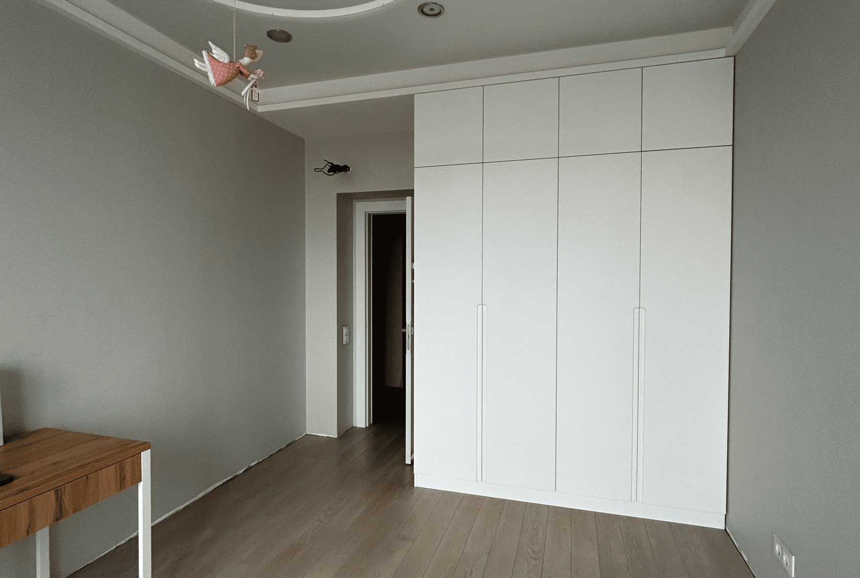 Этот шкаф — пример минимализма, который влюбляет с первого взгляда. Гладкие фасады, интегрированные ручки и чистые вертикали создают ощущение порядка и лёгкости.