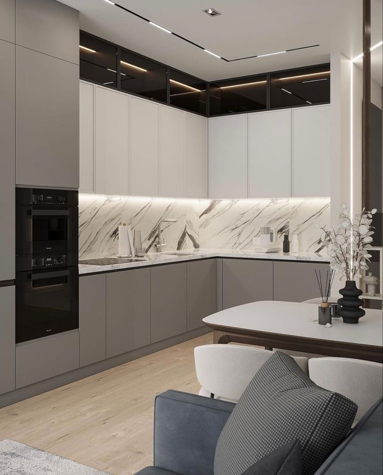 Фасады: МДФ пленка Столешница: EGGER Фурнитура: BLUM Ручки: Интегрированные Корпус: ЛДСП Фартук: EGGER Витрины: Стекло тонированное в профиле Особенности: Подсветка Стоимость: от 200 000 ₽*